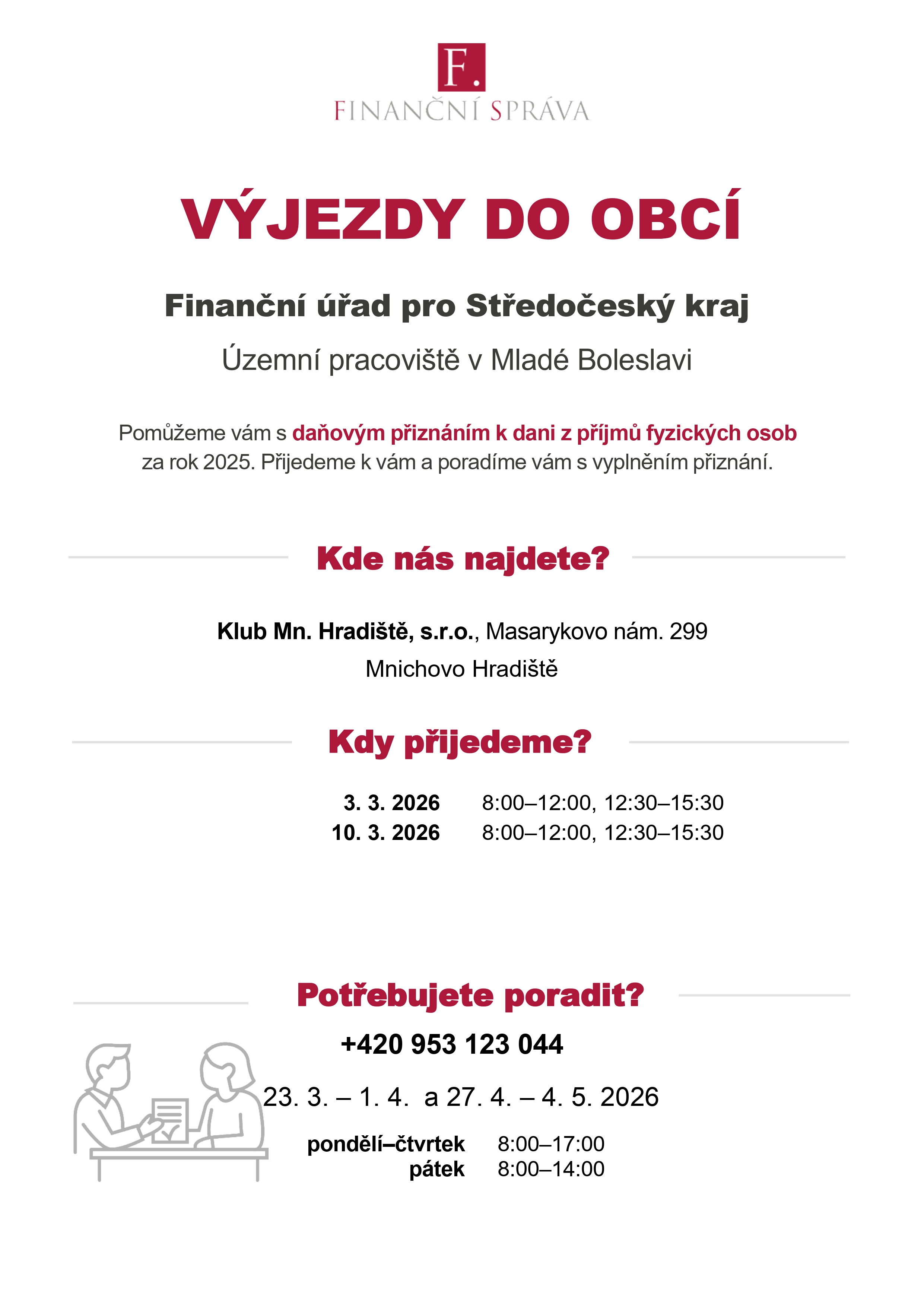 Finanční úřad pro Středočeský kraj nabízí pomoc s vyplněním daňového přiznání k dani z příjmů fyzických osob za rok 2025. Územní pracoviště v Mladé Boleslavi uspořádá výjezd do obce, kde poskytne osobní poradenství. Akce se uskuteční v Klubu Mnichovo Hradiště na Masarykově náměstí 299. Finanční úřad bude k dispozici ve dnech 3. a 10. března 2026. V obou dnech bude poradna otevřena od 8:00 do 12:00 a opět od 12:30 do 15:30. Pro více informací je možné kontaktovat úřad na telefonním čísle +420 953 123 044.